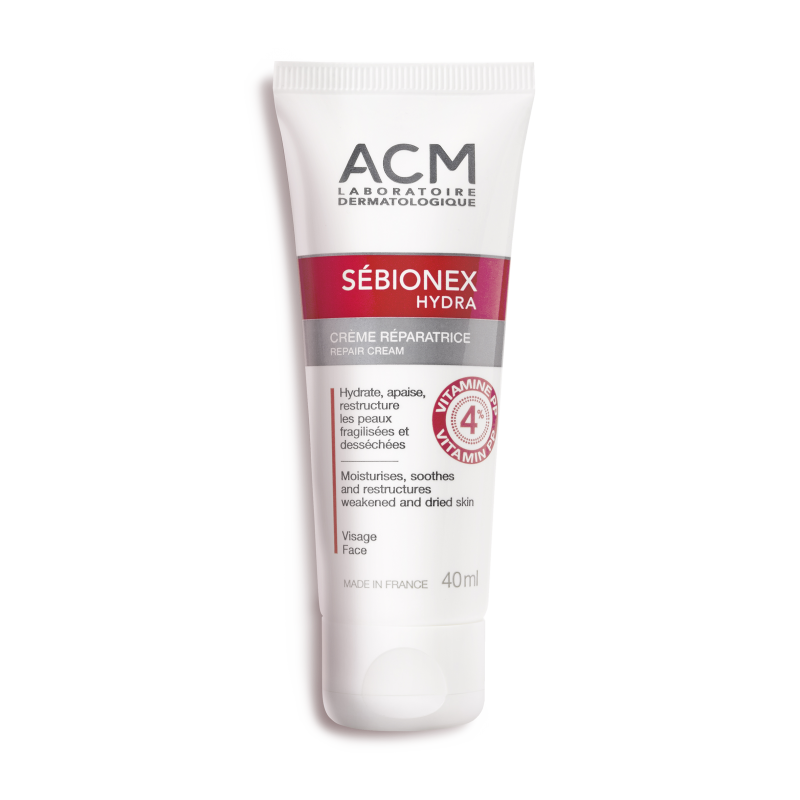 ACM Sebionex Hydra Cream Dermatological anti-acne treatments and external aggressions tend to dry the skin; this care product restores skin comfort. Thanks to its complex of soothing, restructuring and moisturising active substances, Sebionex Hydra cream effectively combats skin dryness, it restructures the skin barrier and soothes sensations of irritation and tautness. Its liquid crystal dosage form improves its touch, along with its reparative and moisturising properties. Sebionex Hydra thus restores skin comfort and compensates for the side effects of some dermatological treatments. It leaves the skin soothed and moisturised.