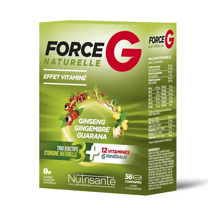 Force G Naturelle is a natural energy supplement combining guarana, ginseng, ginger extracts, essential vitamins, minerals, and caffeine to help reduce fatigue, boost vitality, and support mental focus and overall wellness.