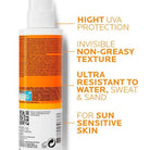 La Roche Posay Anthelios Invisible Spray SPF50+ provides a very high broad-spectrum protection preventing damage caused by UVA, UVB Infrared-A, and pollution. Ultra-resistant to water, sweat, and sand. Anti-eye stinging. Lightweight, non-sticky texture. The formula forms a strong network of protection providing homogenous, non-migrating, non-greasy, and very resistant protection. Tested under dermatological control. Allergy tested.