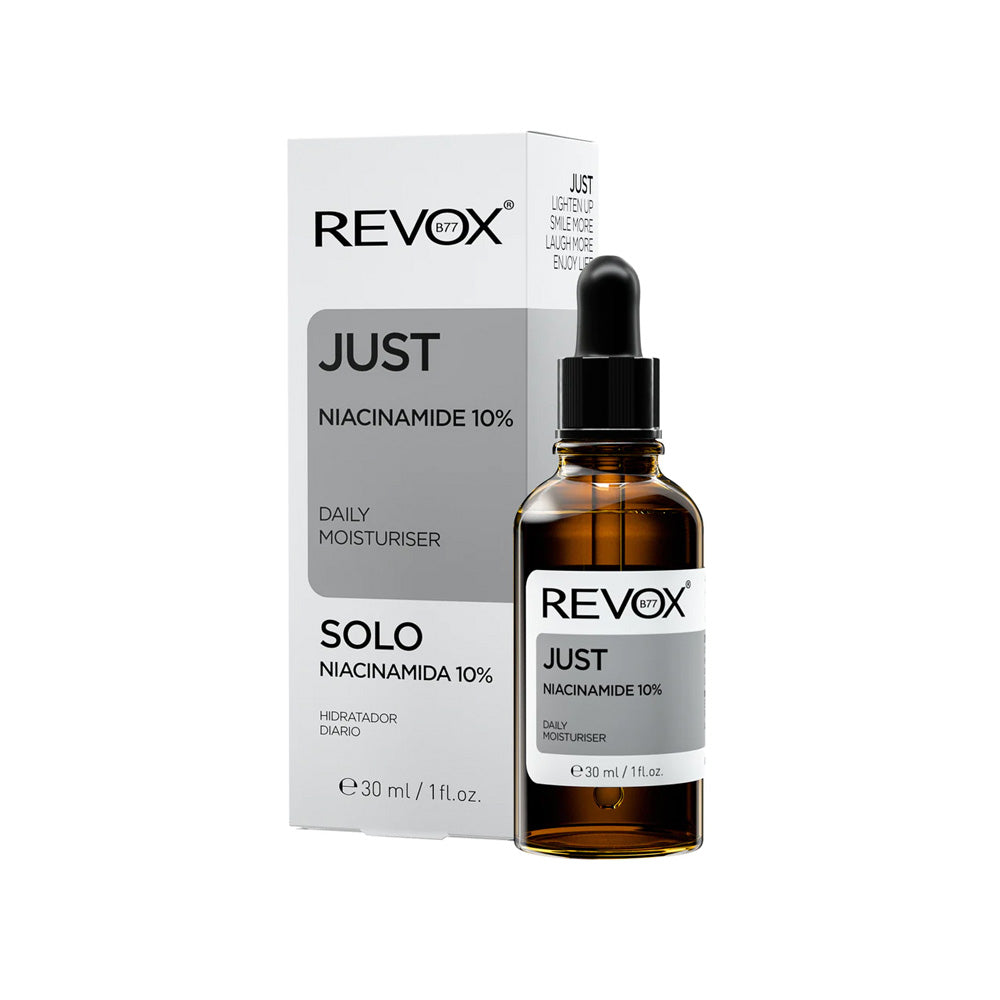 Revox B77 – JUST Niacinamide 10% Daily moisturiser for face and neck. Niacinamide is a form of Vitamin B3 - one of the eight B Vitamins needed for a healthy body and skin. Vitamin B3 helps reduce the appearance of imperfections, leaving the complexion smoother. It helps improve the skin's barrier function to protect it from external pollutants and prevent loss of moisture.