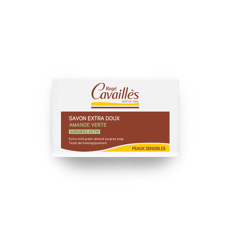 rogé cavaillès extra-mild soap green almond is a flagship product of the rogé cavaillès brand. extra-mild surgras soap with green almond for sensitive skin is specially formulated to cleanse all the family’s sensitive skin. enriched with surgras agents, this soap for sensitive skin helps protect your skin from external irritants and strengthens its hydrolipidic film, helping it feel soft and supple every day. this mild body soap combines the nourishing and softening properties of sweet almond oil and peach kernel oil. it gives your skin all the comfort it needs and helps it retain its natural moisture.