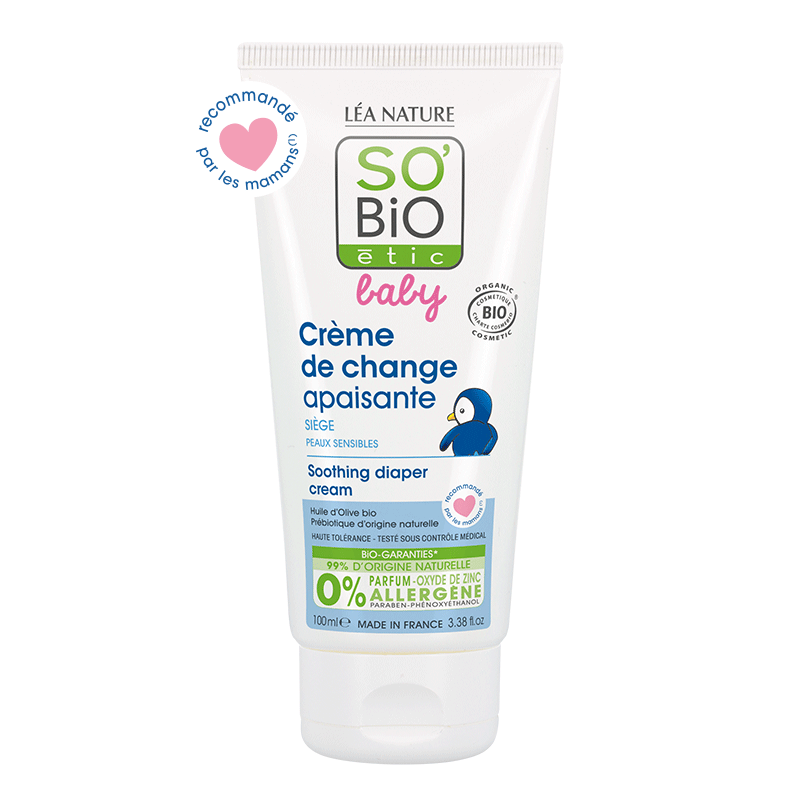 SO BiO étic® Baby Diaper Cream without zinc oxide, which prevents and calms redness of the diaper area, starting at birth.