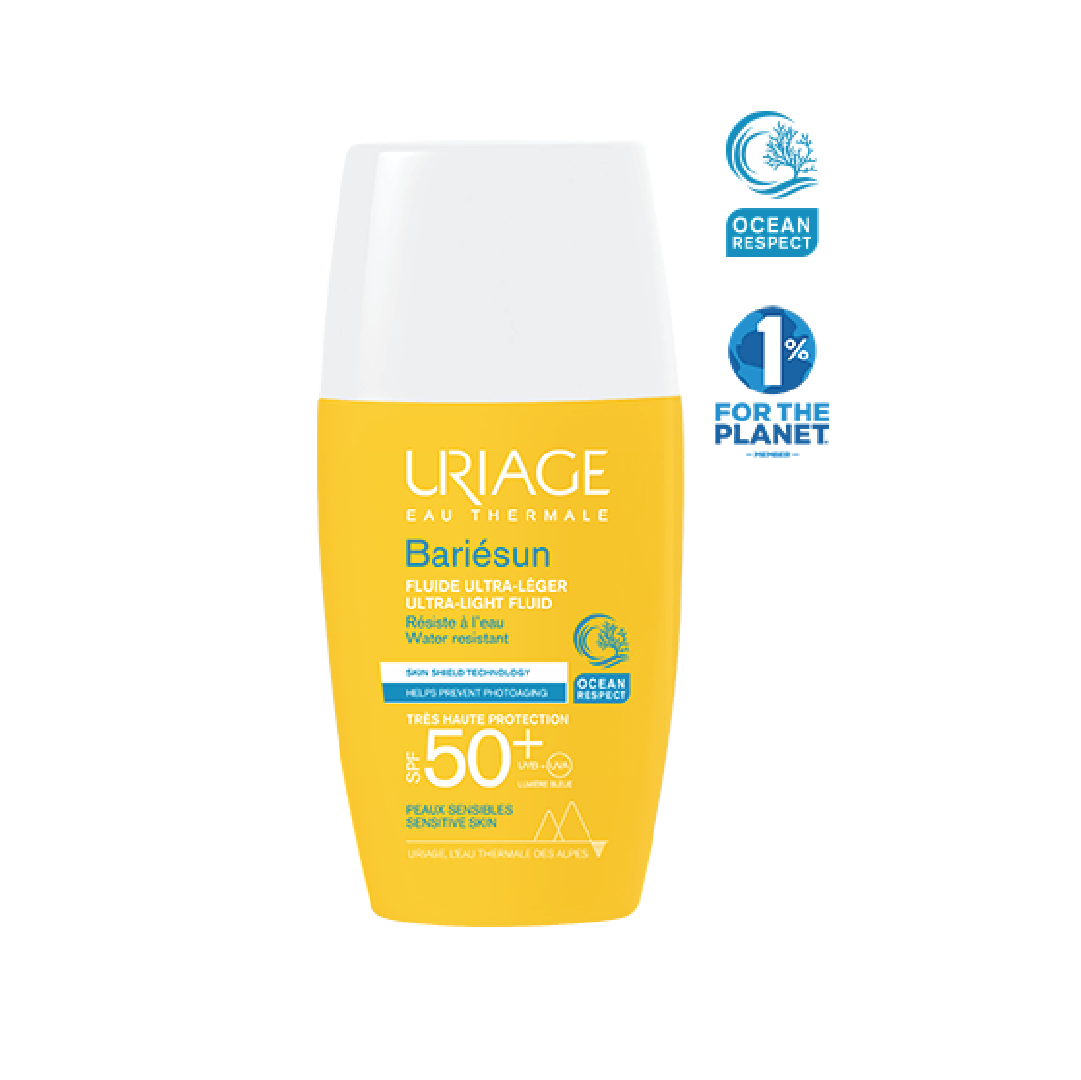 uriage bariésun ultra-light fluid spf50+ combines a very high-performance filter complex and two dermatological patents to protect the skin, prevent cellular damage and photoaging caused by uva and uvb rays and blue light.
