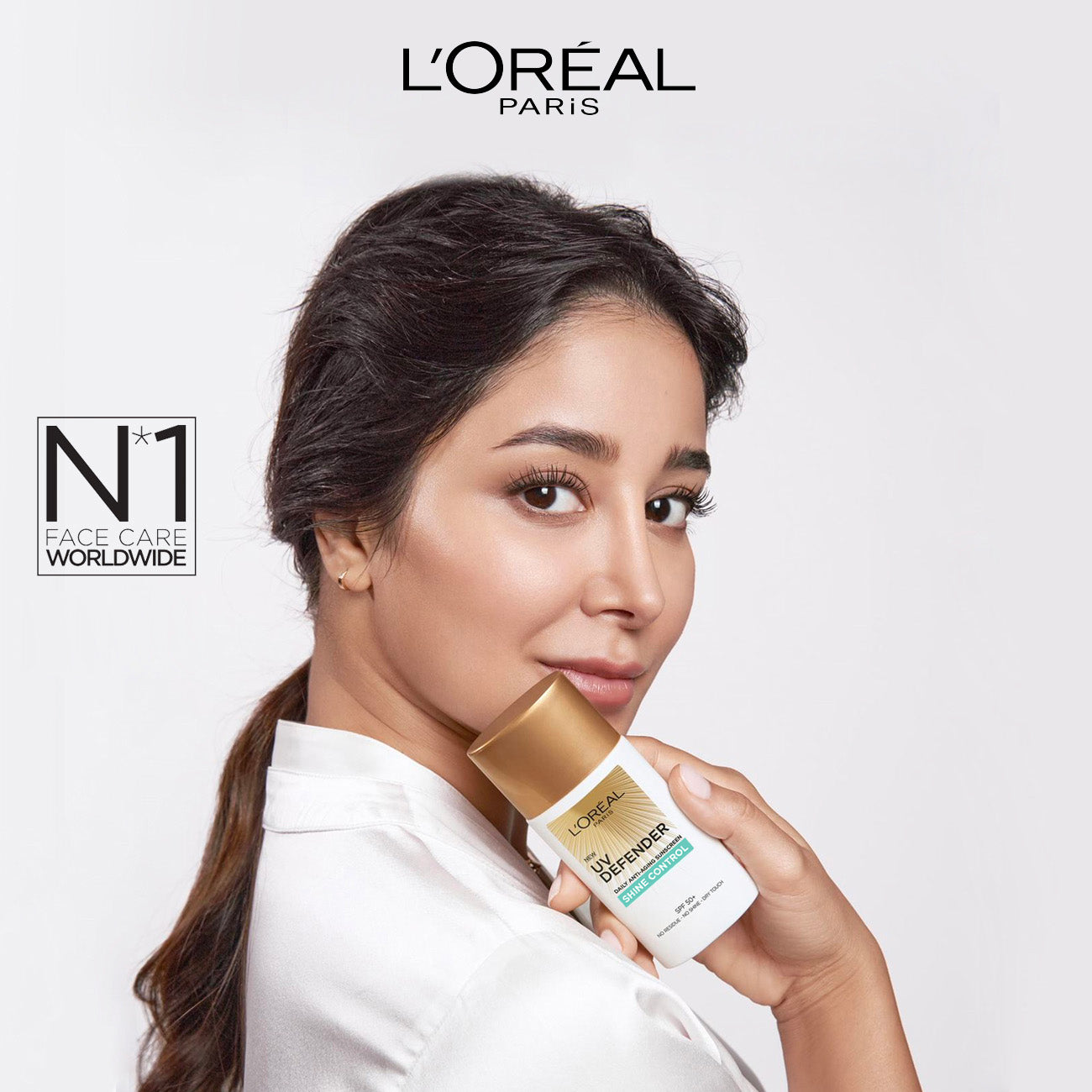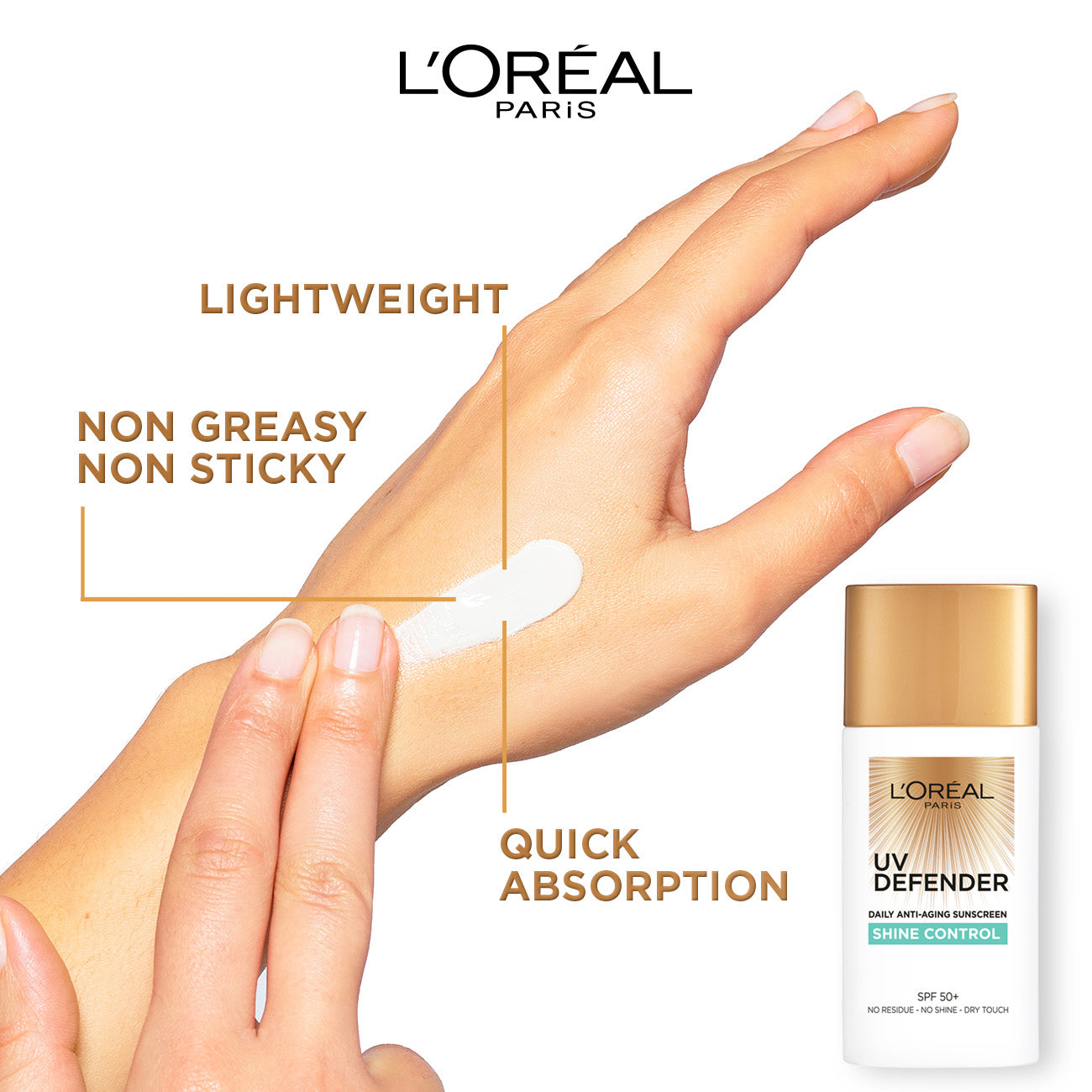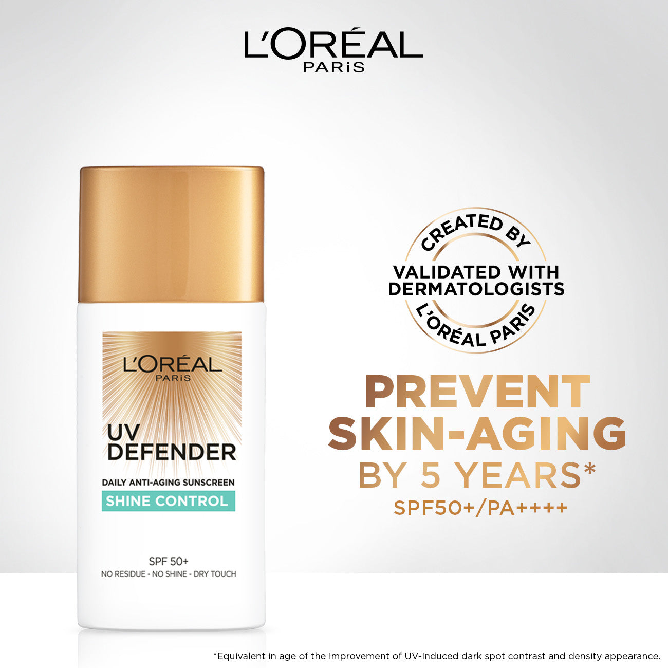 l'oréal paris skin expert uv defender spf50+ shine control is a lightweight, high-protection sunscreen designed to control shine and protect your skin from harmful uv rays. with its broad-spectrum spf50+ formula, it shields the skin from both uva and uvb rays, helping to prevent sun damage, dark spots, and premature aging. enriched with a shine-controlling formula, this sunscreen helps absorb excess oil, leaving the skin matte and fresh throughout the day. its non-greasy, non-comedogenic texture makes it ideal for oily and acne-prone skin, offering hydration and a balanced complexion without clogging pores.