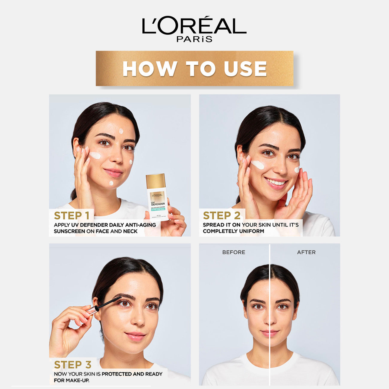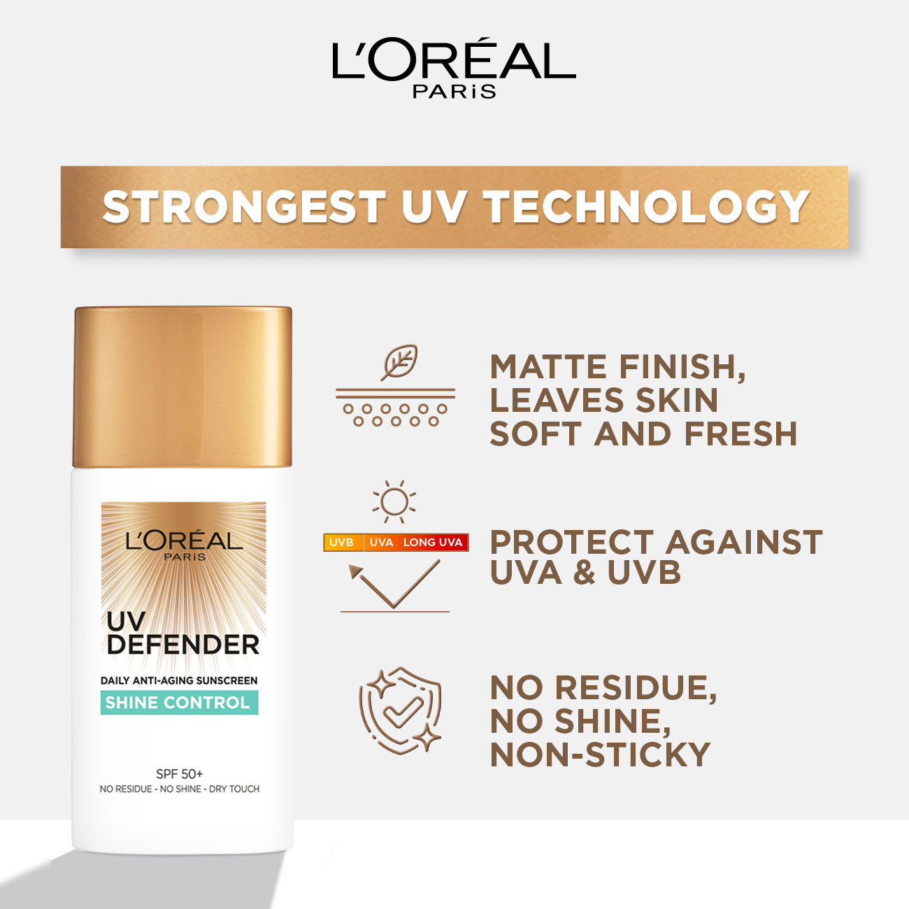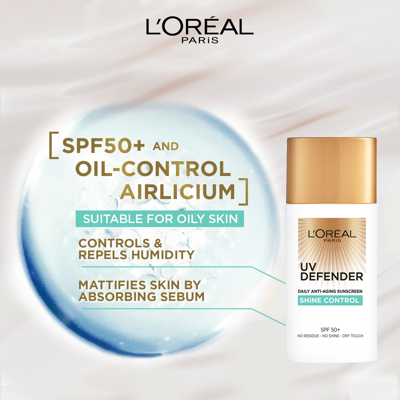 l'oréal paris skin expert uv defender spf50+ shine control is a lightweight, high-protection sunscreen designed to control shine and protect your skin from harmful uv rays. with its broad-spectrum spf50+ formula, it shields the skin from both uva and uvb rays, helping to prevent sun damage, dark spots, and premature aging. enriched with a shine-controlling formula, this sunscreen helps absorb excess oil, leaving the skin matte and fresh throughout the day. its non-greasy, non-comedogenic texture makes it ideal for oily and acne-prone skin, offering hydration and a balanced complexion without clogging pores.