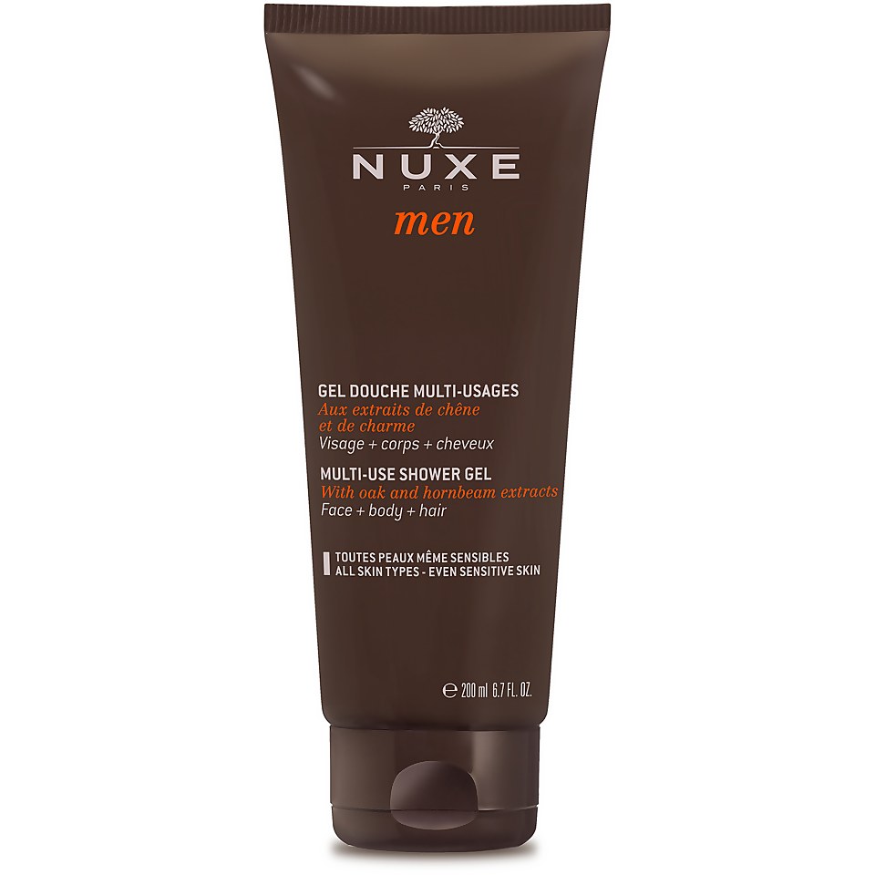 Nuxe Men Gel Douche Multi-Usages is a versatile 3-in-1 shower gel designed for men's facial, body, and hair cleansing needs. Formulated with oak and hornbeam extracts, it provides a refreshing and energizing experience while leaving a subtle, pleasant scent. Its plant-based cleansing base and physiological pH ensure gentle cleansing suitable for all skin types, including sensitive skin.