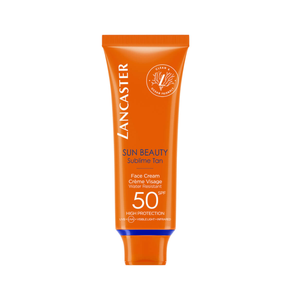 lancaster sun beauty face cream spf50 helps repair skin from sun induced damage. ultra-lightweight, non-greasy and immediately invisible on skin, our unique formula provides a healthy-looking golden tan in twice less time of sun exposure.