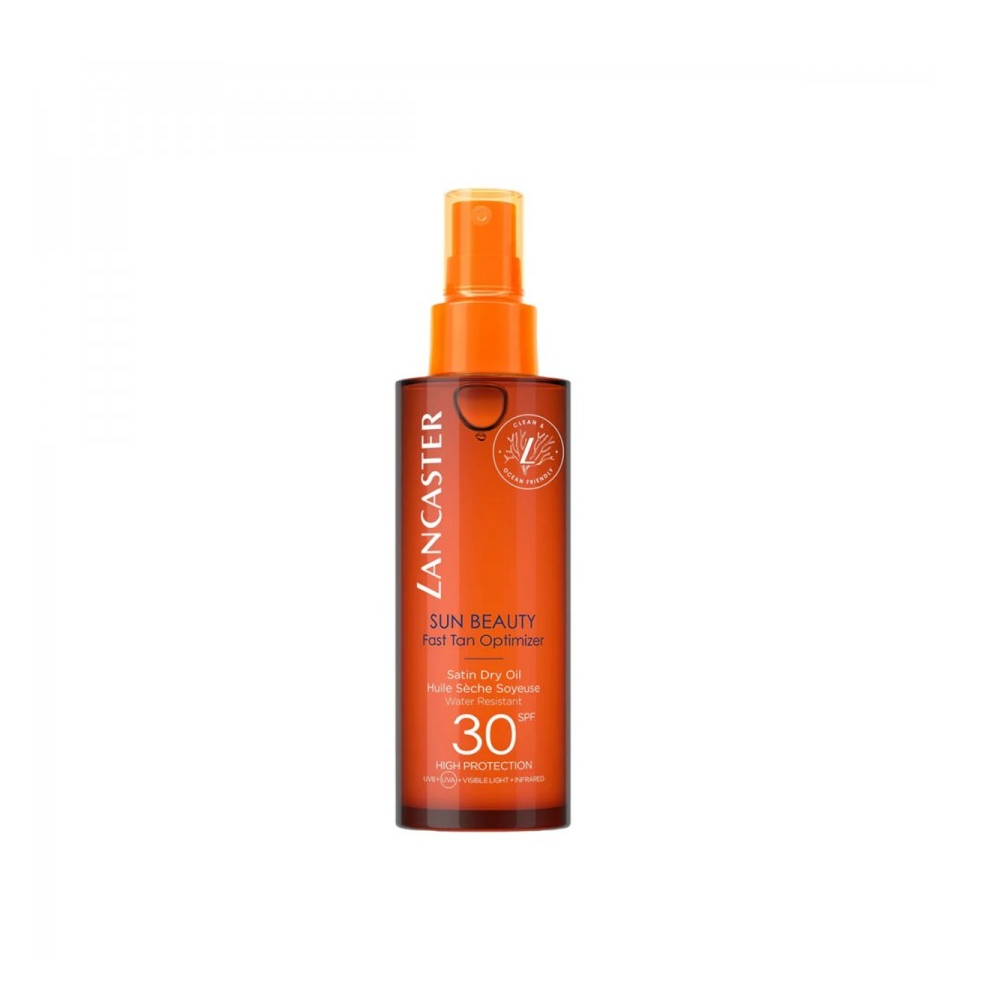 lancaster sun beauty fast tan satin dry oil spf30 is a high sun protection resistant to water, for face and body, respectful of the skin and oceans. this highly sensory sublimating oil offers a dry satin finish, for a golden "healthy glow" tan, even faster, even and lasting: