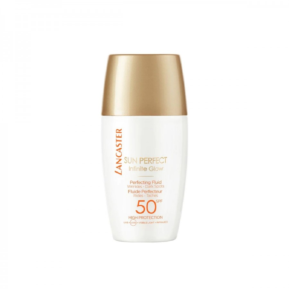 lancaster sun perfect infinite glow perfecting fluid spf50 is an anti-aging, high protection facial sunblock. lightweight texture delivers a nude skin sensation. tinted fluid formula helps blur irregularities to instantly improve skin's appearance. helps prevent & reduce the appearance of wrinkles & dark spots. harnesses full light technology containing uva/uvb filters to provide high protection. shields skin against infrared & visible light as well. leaves a powder-matte finish that visibly perfects the complexion.