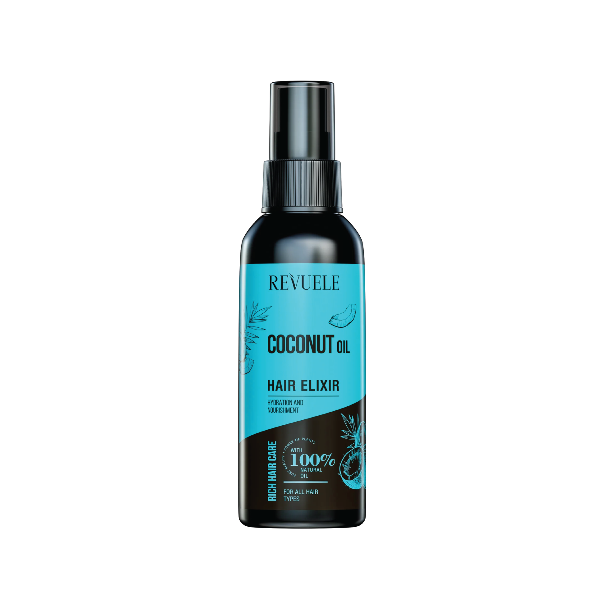 revuele coconut oil hair elixir is a nourishing hair treatment that helps to revitalize and hydrate dry, damaged hair. infused with coconut oil, this elixir provides deep nourishment to each strand, promoting smoother, shinier, and healthier hair. it strengthens the hair, preventing breakage and split ends while enhancing its natural shine. the lightweight formula absorbs quickly without weighing down the hair, making it perfect for all hair types, especially for those with dry or brittle hair.