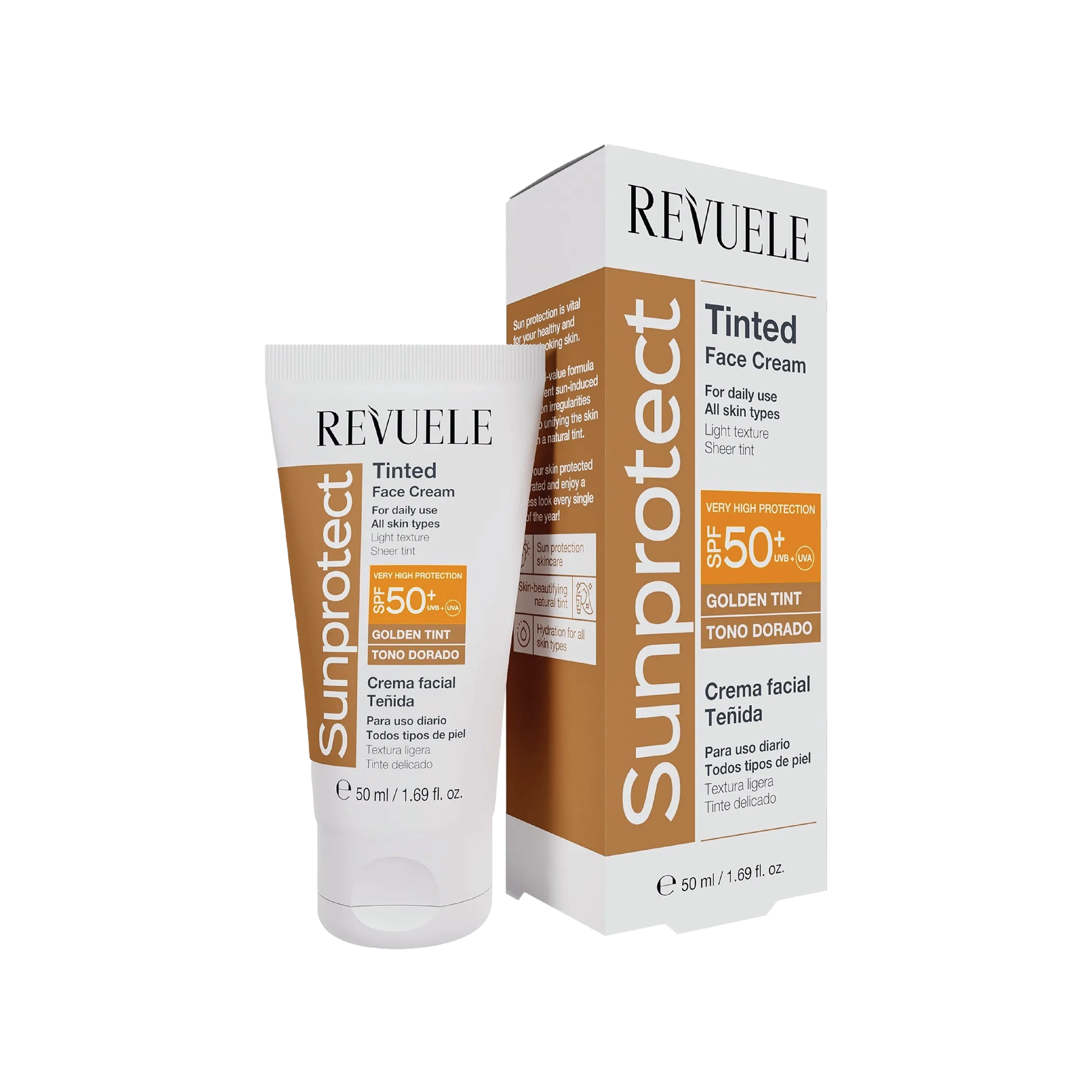 revuele sunprotect tinted face cream spf50 provides high-level protection against harmful uv rays while giving your skin a subtle, even tint. this lightweight, non-greasy formula helps to protect the skin from sun damage and premature aging, while the tint provides a natural-looking glow and coverage. ideal for daily use, it hydrates and nourishes the skin while protecting against environmental stressors.