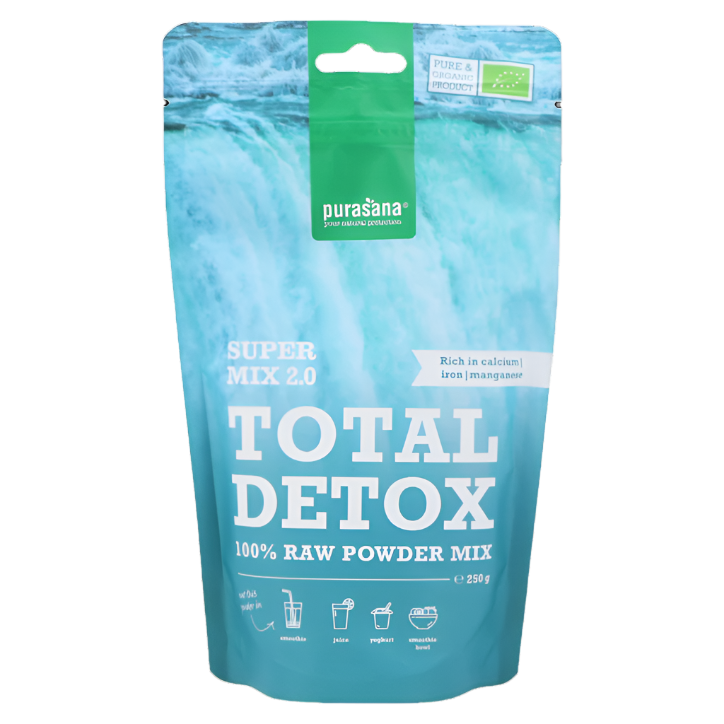 purasana total detox mix detox mix 2.0 is a carefully selected blend of quality powders and contains spirulina & barley grass. spirulina improves vitality and energy. calcium contributes to the normal functioning of digestive enzymes. iron and manganese contribute to and normal energy-generating metabolism.