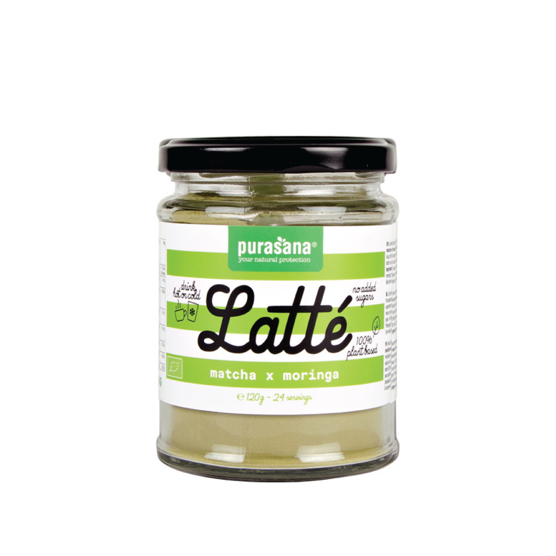 purasana matcha moringa latte take a latte break with our matcha/moringa latté. sugar-free and 100% plant-based. matcha is a green tea powder and an excellent source of vitamins and minerals. it is distinctive and its richness in nutritional contributors rightly makes it a superfood. the leaves and fruits of the tree moringa have extremely high nutritional value. it is richer in essential vitamins and minerals than many other superfoods.