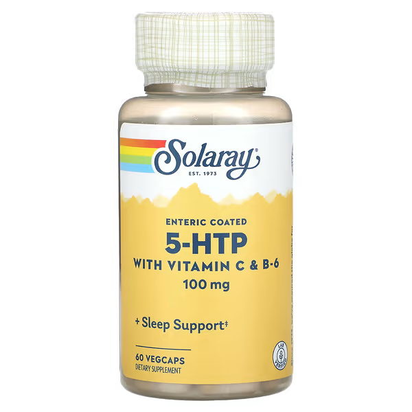 Solaray 5-Htp with Vitamin C 100 mg contains 100mg of L-5-hydroxytryptophan per capsule. You'll also find Vitamin B6 and Vitamin C. These ingredients work together to encourage healthy serotonin levels, which in turn may help you avoid feelings of melancholy and unhappiness.