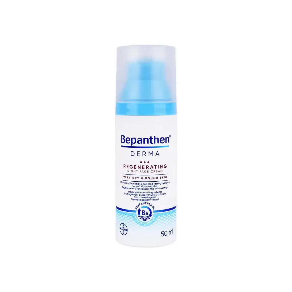 Bepanthen Derma Regenerating Night Face Cream is a deeply moisturizing overnight face cream designed to rehydrate and regenerate very dry, sensitive skin while you sleep. Its rich, non-greasy formula provides immediate and long-lasting hydration (up to 48 hours), helps soothe dryness and irritation, and supports the skin’s natural repair processes. The cream restores softness, smoothness, and natural radiance without fragrance, preservatives, or colorants, making it suitable for sensitive skin.