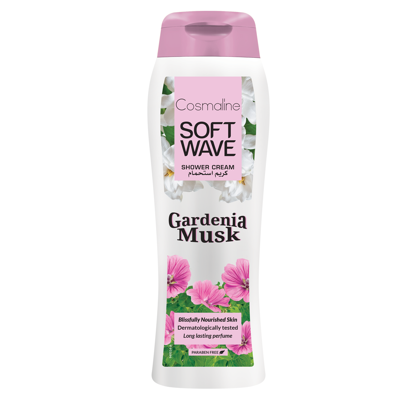 cosmaline soft wave shower gel gardenia musk is a luxurious body wash designed to cleanse, hydrate, and soften the skin. infused with the enchanting fragrance of gardenia and musk, this shower gel offers a soothing and refreshing experience. it is dermatologically tested, paraben-free, and known for its long-lasting moisturization and foaming properties. this product is ideal for those seeking a gentle yet effective cleansing solution that leaves the skin feeling soft and delicately scented.