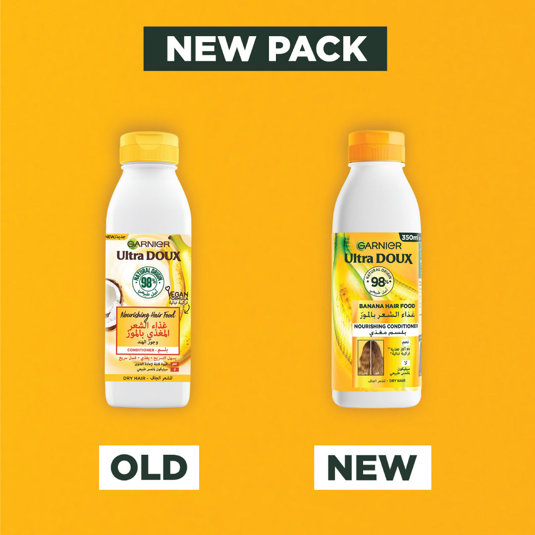 ultra doux banana vegan hair food conditioner nourish dry hair, 7x more nutrition, first nutritional fact-based haircare, 350ml, no silicone, no artificial colorants, 98% natural origin ingredients, cruelty free, vegan, made of 100% recycled plastic