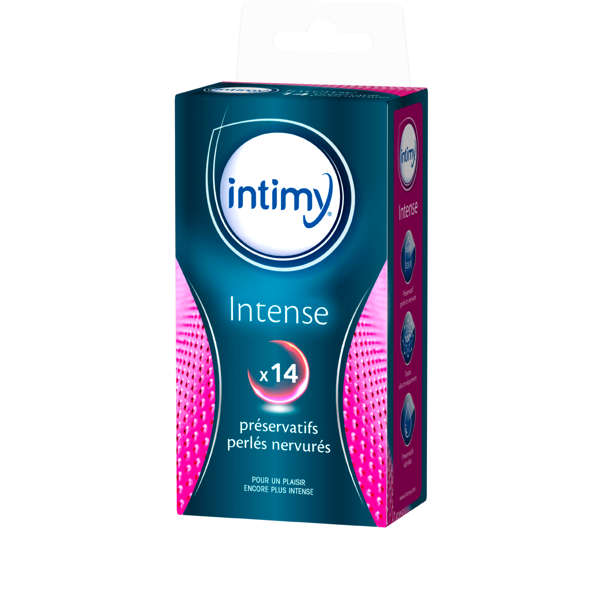 intimy intense 14 pieces are lubricated male condoms designed for enhanced pleasure and protection. they are made from natural rubber latex with a reservoir tip and a textured surface or stimulating features (often ribs or dots depending on the variant) to intensify sensation for both partners. these condoms are individually electronically tested to meet european safety standards and come in a pack of 14 for regular use.