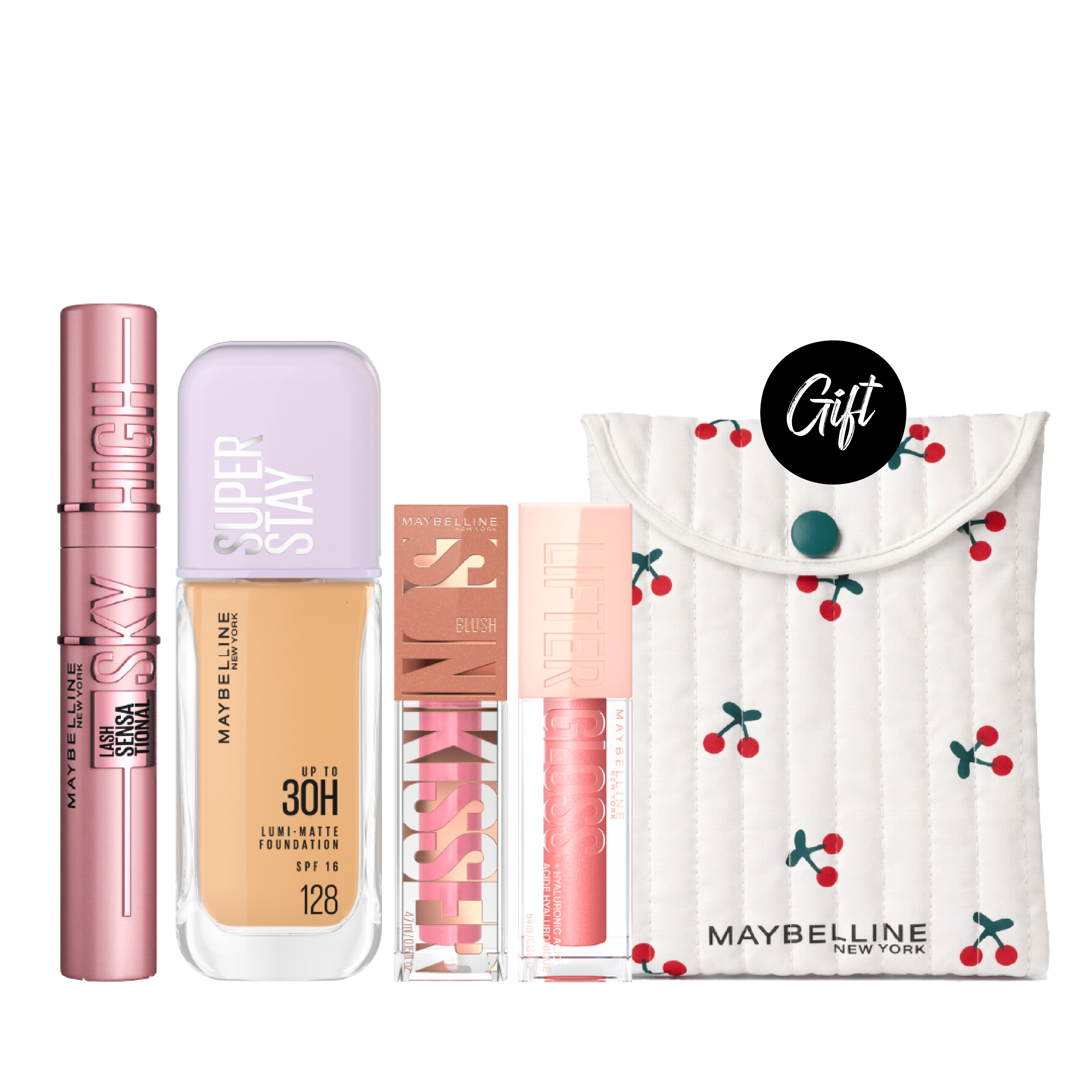 Maybelline New York Lash Sensational Sky High Mascara + Maybelline Super Stay 30H Lumi-Matte Foundation 35 ML + Maybelline Sunkisser Blush + Maybelline Lifter Gloss + Gift: Pouch