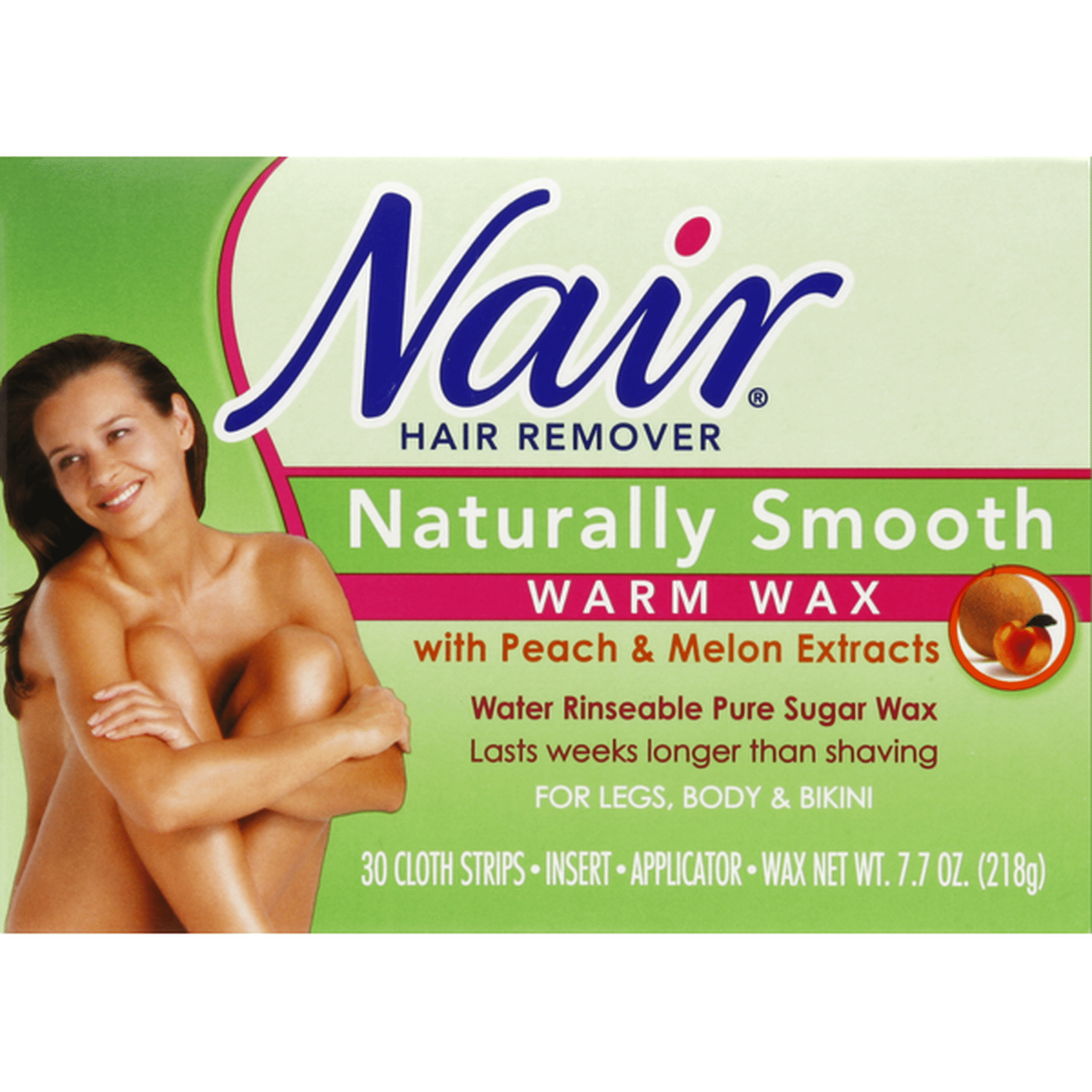 nair body wax strips – peach & melon: naturally smooth. water rinseable pure sugar wax. lasts weeks longer than shaving. for legs, body & bikini. insert. applicator. wax. water rinseable pure sugar wax. ready in 15 seconds. lasts weeks longer than shaving. good for sensitive & delicate areas. salon tested. dermatologist tested. no animal testing. natural wood applicator. reusable & washable strips. naturally smooth fresh peach melon microwavable wax.