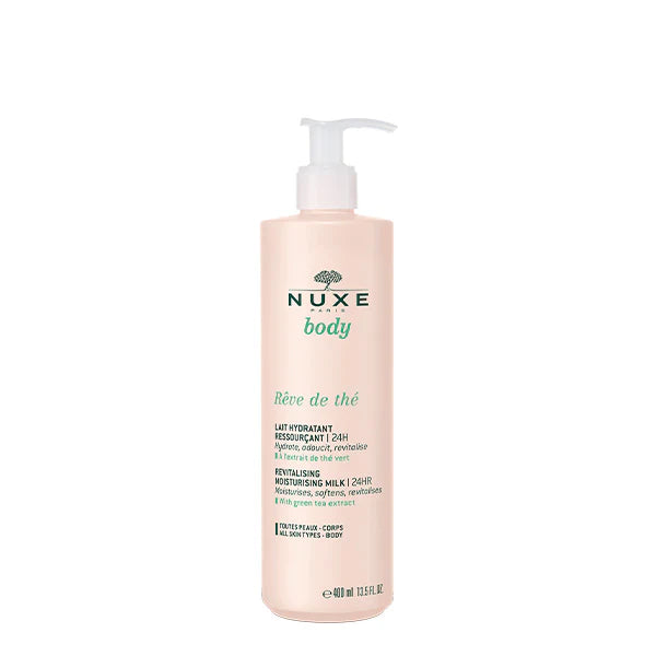 nuxe rêve de thé revitalizing moisturizing milk 24h is a body lotion that provides 24-hour hydration, revitalizing the skin and enveloping it in subtle green tea notes. its fresh and melting texture penetrates quickly, allowing you to dress immediately.