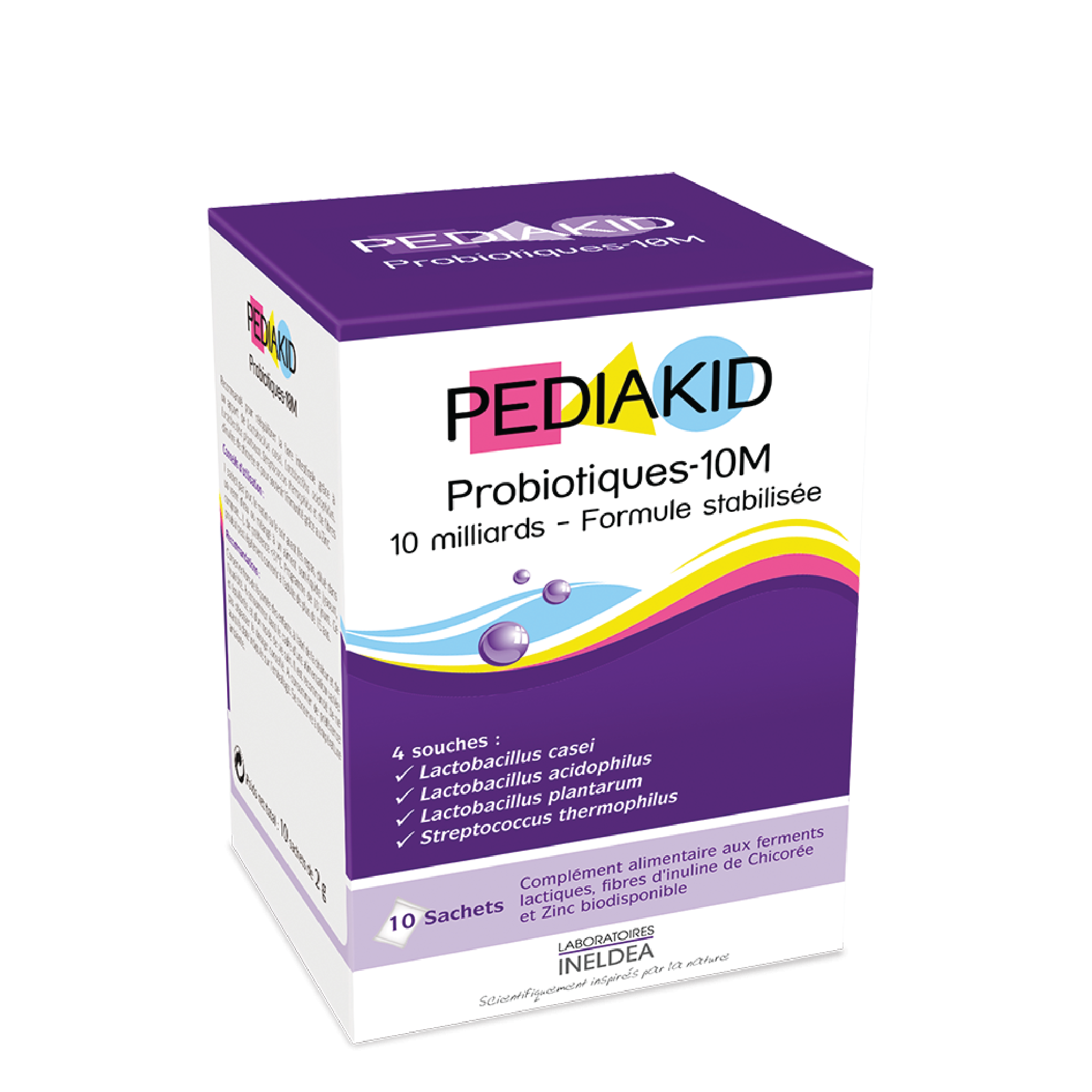Pediakid Probiotique -10M was elaborated with lactic ferments (lactobacillus casei, lactobacillus acidophilus, lactobacillus plantarum, streptococcus thermophilus) selected to bring back balance to the intestinal flora.