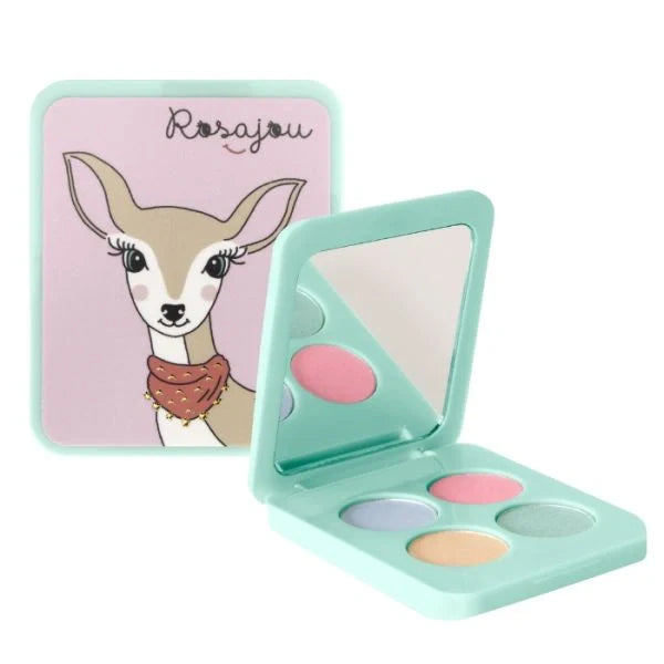 rosajou eyeshadow 4 face powders: pink, golden, blue and green. to enhance the look and make doe eyes.