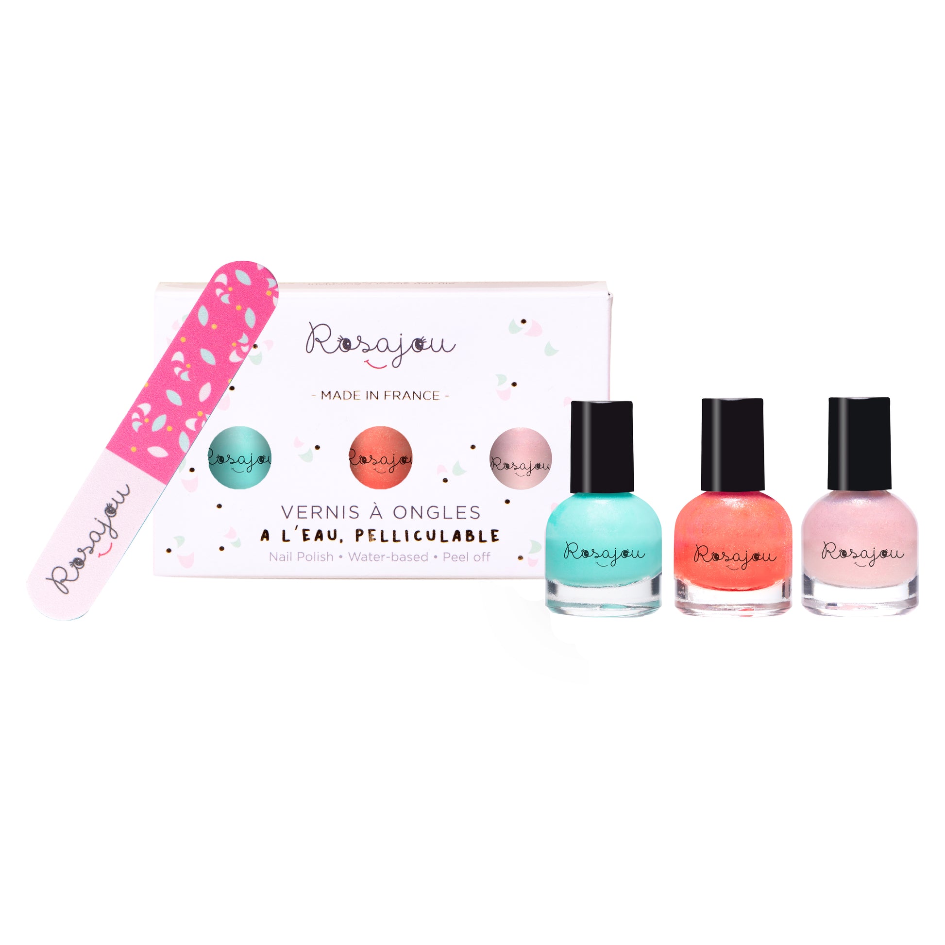 rosajou nail polishes set lagon x corail x ballerine + nail file is an adorable box of 3 nail polishes for children.