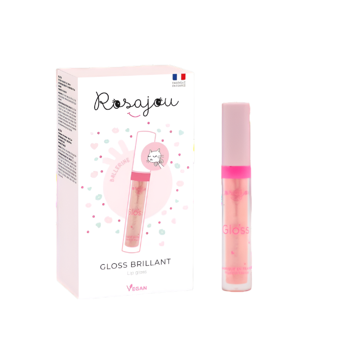 rosajou vegan gloss "ballerine" is ultra-glossy, pearly gloss that brings pink color to the lips of coquettish kids. rich in apricot oil with emollient, softening and nourishing properties, it restores the skin's moisture-lipid film to protect against dryness.