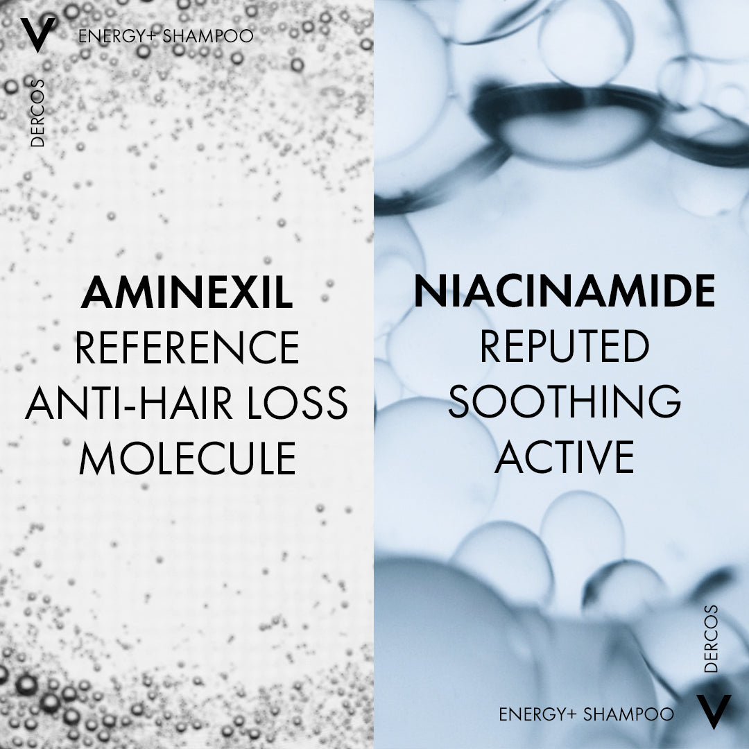 vichy dercos energy + stimulating shampoo is enriched with vichy's patented molecule aminexil,niacinamide, aha and vitamine. energy + shampoo is designed to reduce the rate of hair loss, increase volume from the first application . developed as a complement to hair-loss treatments, this shampoo is the only shampoo containing aminexil. hair is left feeling nourished, revitalized, and reinforced from root to tip, with an energized feel. hair becomes stronger and more vigorous from roots to tips after 3 weeks. clinically reduces hair loss after 6 weeks. suitable for all hair types.